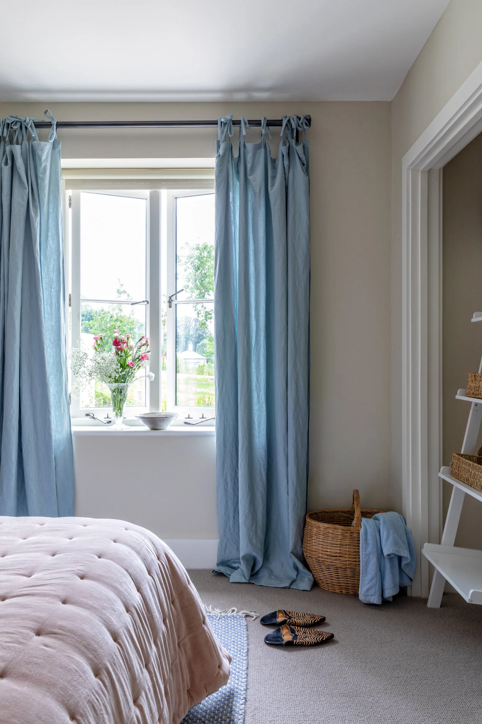 Tie curtains use fabric strips that are tied in a decorate knot/bow to attach to a pole, the same fabric can be used or a contrasting one. Informal and delicate, they make a great match for bedrooms. The curtain pole needs to be thin enough to fit through the loops; opening and closing this curtain can be harder where there is fabric resistance and friction. Suitable for use with a curtain pole.