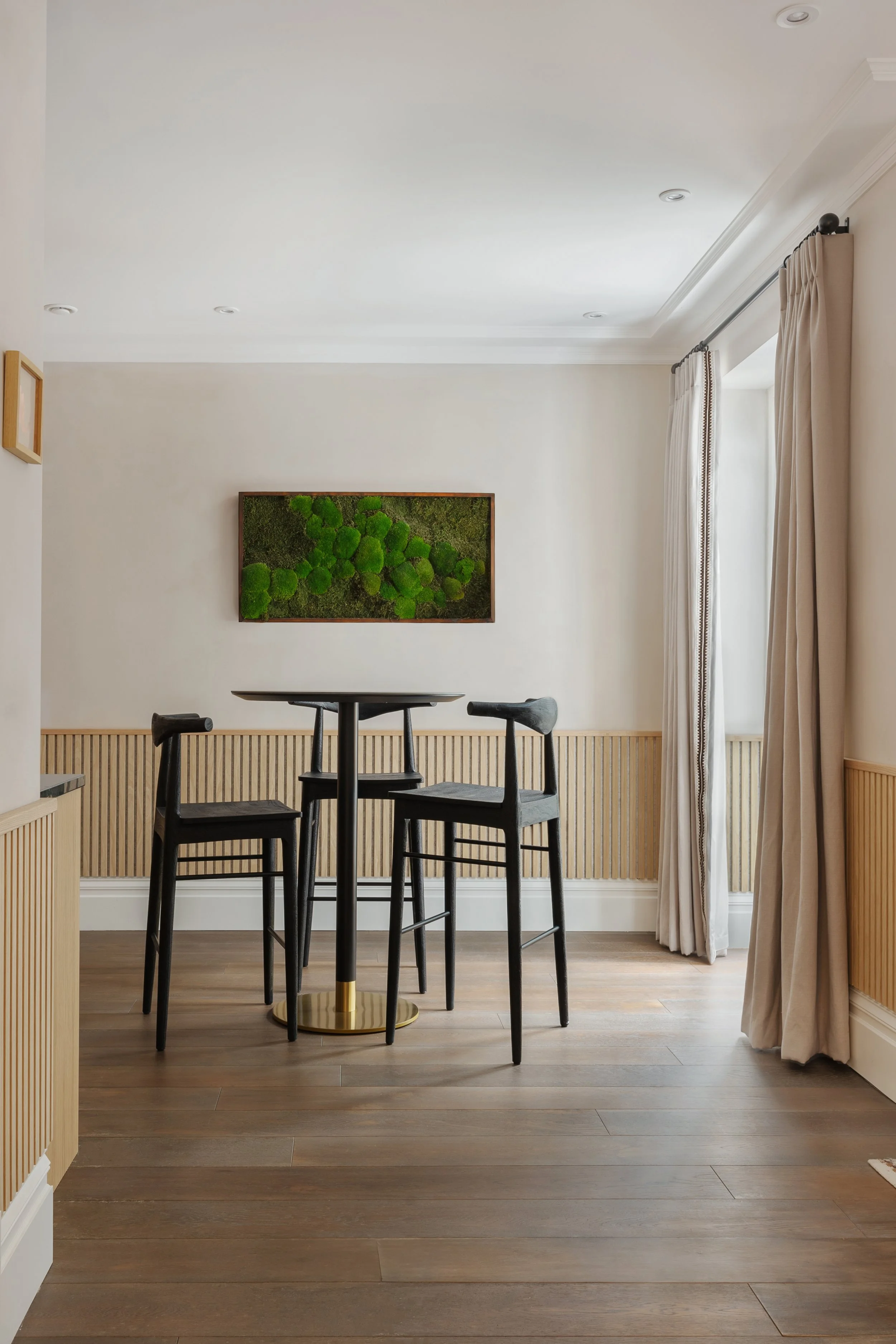 Once a blank canvas, the Bar Room is now an elegant setting for intimate gatherings and sophisticated soirées. Soft beige Bauwerk walls provide the perfect backdrop for a bespoke oak veneer bar with graceful, arched bronze mirrors and custom brass shelving.
