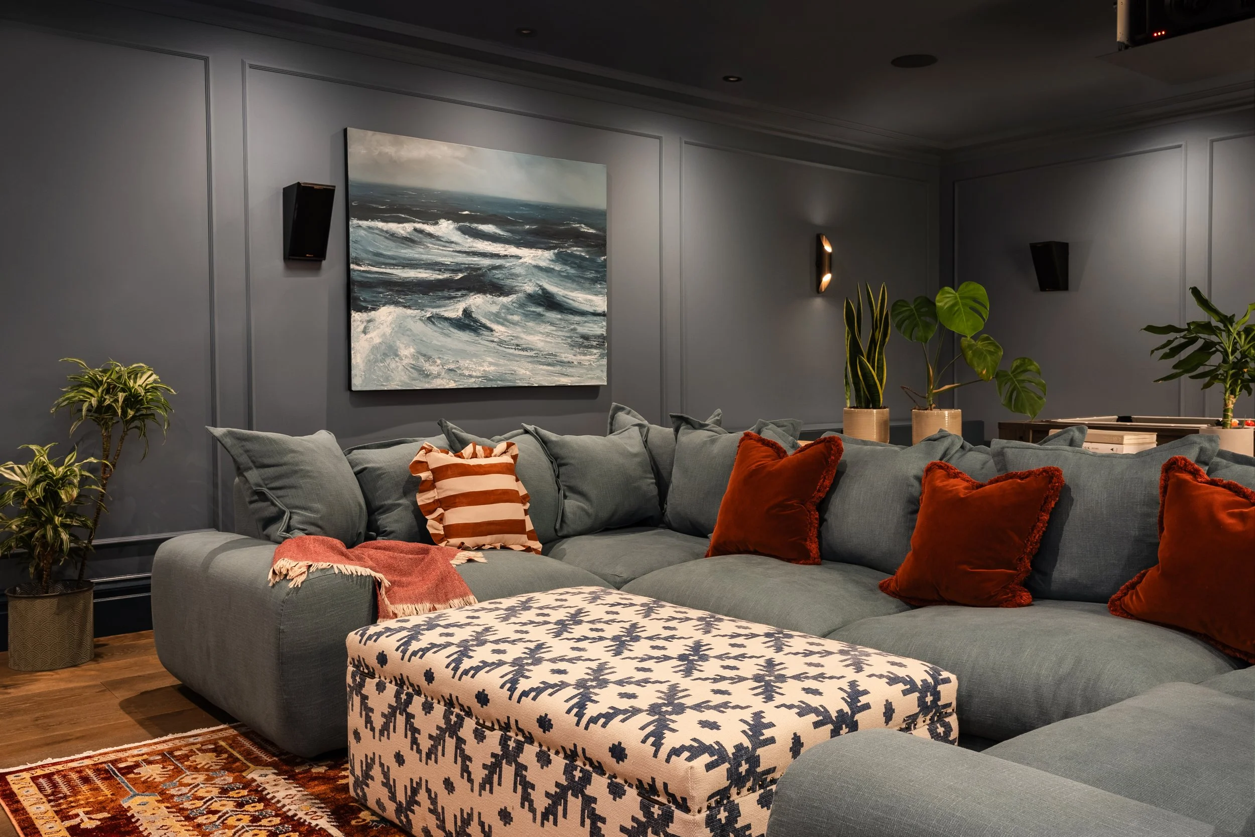 The Media Room was transformed into a dramatic, immersive space where family movie nights and games are always in style. Dark navy walls and custom panelling set the mood, while a bespoke C-shaped sofa, plush area rug, and an array of soft furnishings create a cosy, inviting atmosphere.