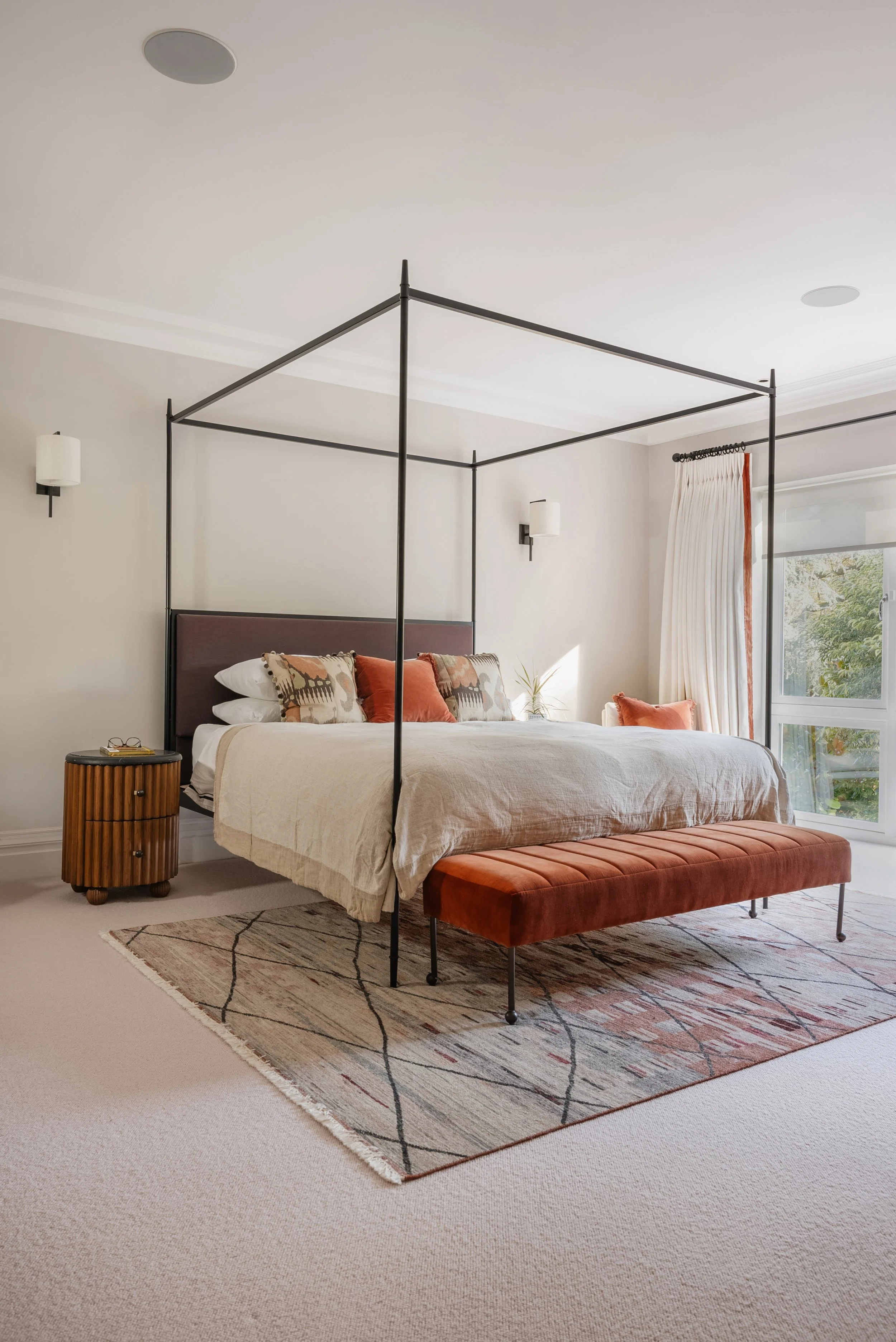 The Main Bedroom was designed with serenity and comfort in mind, working with the client’s existing furniture while introducing new pieces to enhance the space. Two armchairs create a perfect spot for quiet reflection or reading, while carefully chosen accessories and layered textures bring warmth and cohesion. The room is a perfect balance of restful luxury, providing the ideal retreat at the end of a busy day.