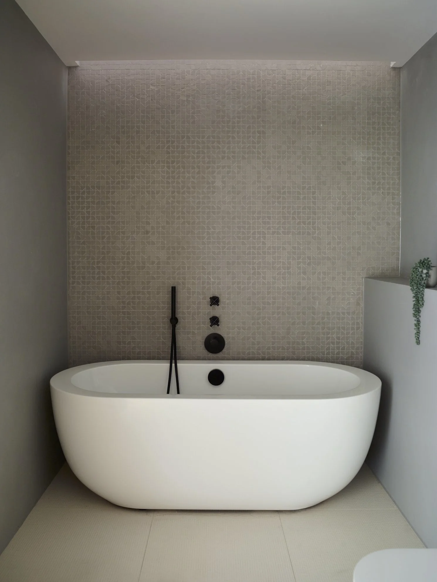 The main en-suite is finished in a combination of white microcement and natural marble tiles. The vanity unit was custom made and the taps are Dornbracht.