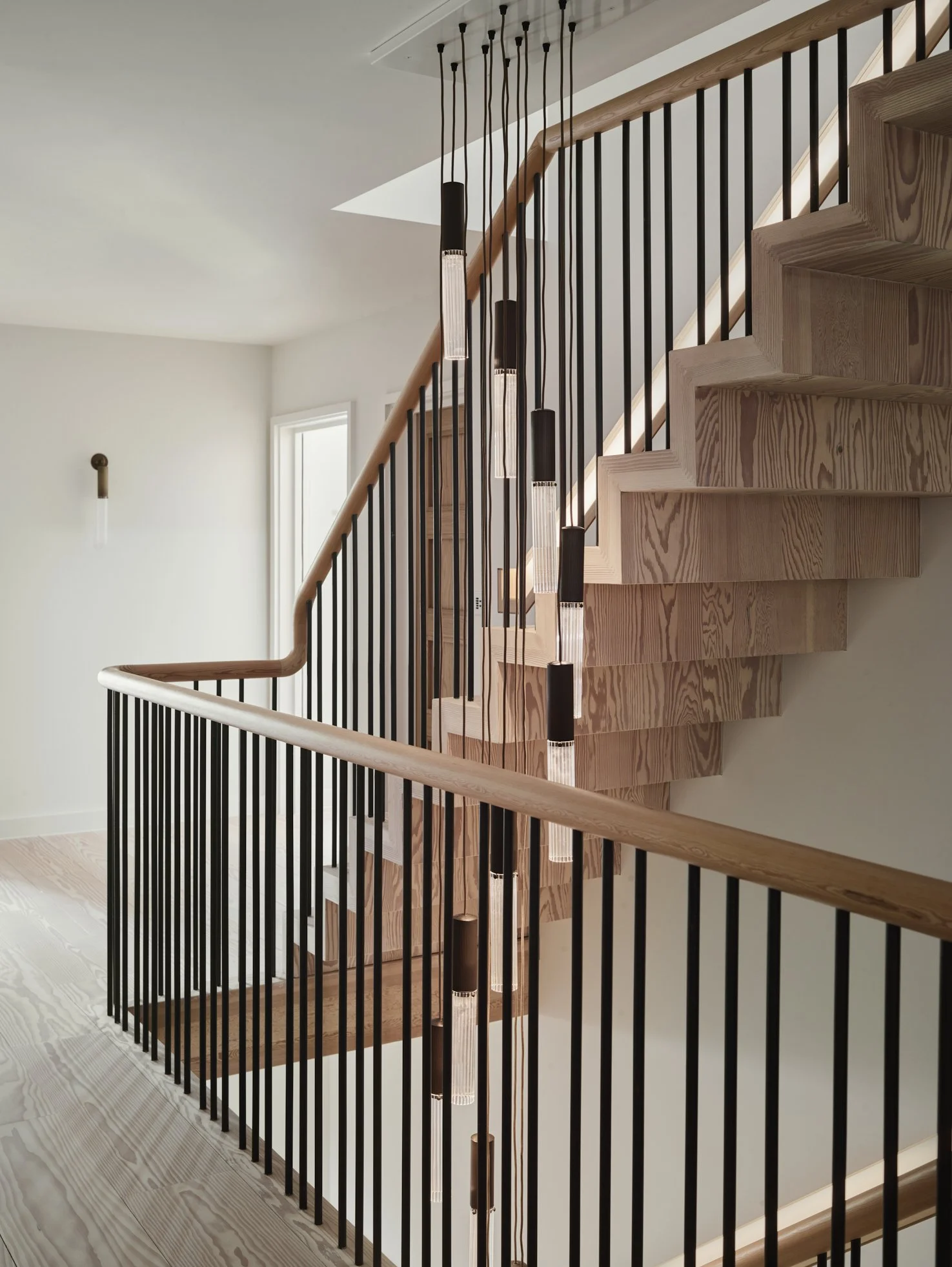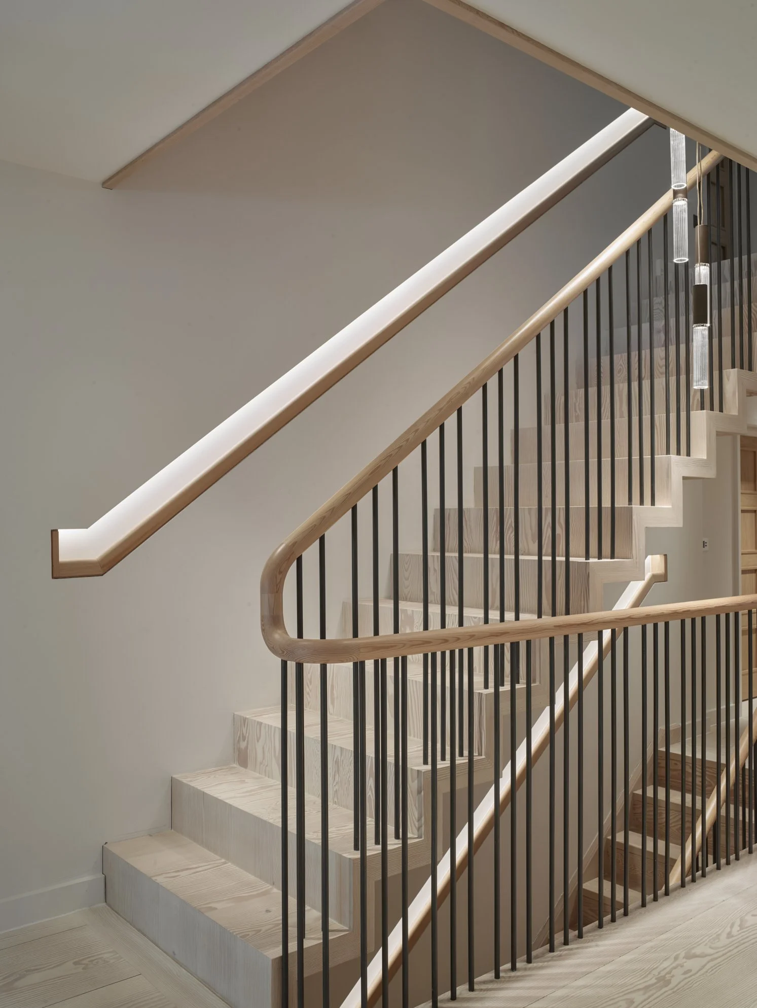 Our client wanted the staircase to be a striking feature of the house - we worked with Smet to design this minimal, contemporary staircase made using Douglas Fir to match the Dinesen flooring. The staircase was beautifully lit up with a bespoke chandelier by J Adams & Co, spanning across two storeys, as well as a recessed handrail which was lit with concealed LED lighting.