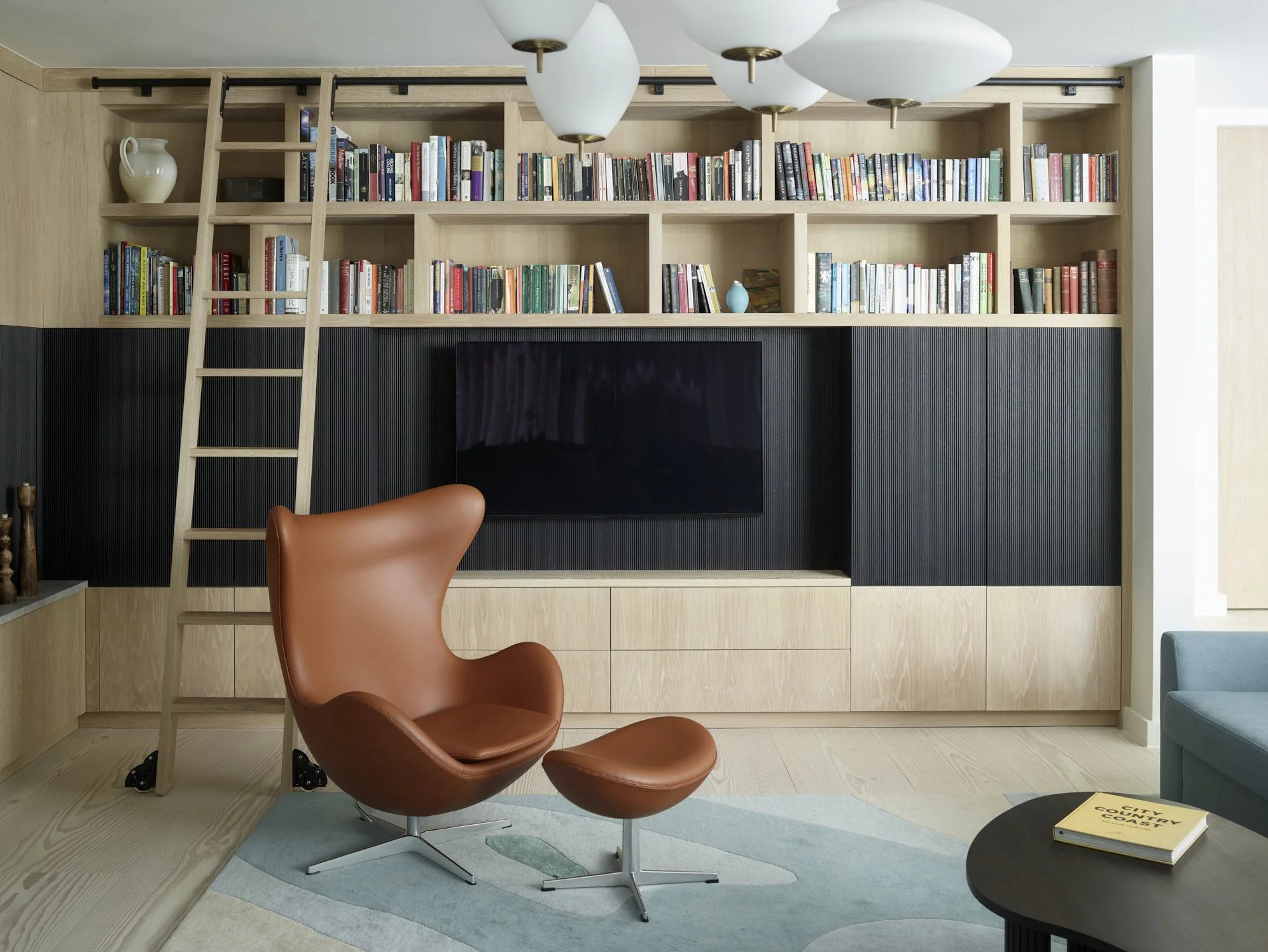 The living room design incorporated built in storage along two walls, with black fluted panelling cleverly disguising the TV on one wall as well as library storage accessible with a sliding ladder, and a black marble fireplace creating a focal point on the other. The large ‘C-shaped’ sofa was custom made to fit the space, as was the ‘wave’ rug that was designed by Pia Design, incorporating curves and waves into the design to offset the crisp clean lines.