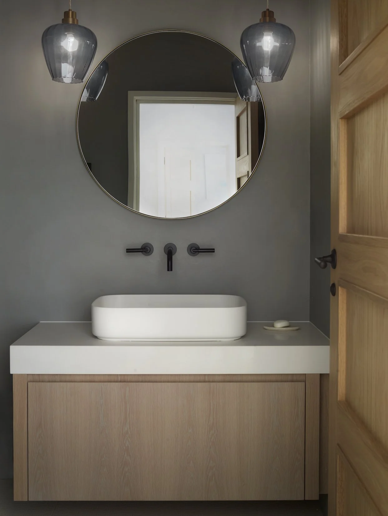 The house also has a small guest bedroom, finished in grey microcement with light oak veneer wardrobes (just out of view). The guest bathroom (below) was finished in a combination of microcement and recycled glass tiles with decorative pendant lights from Heathfield & Co.